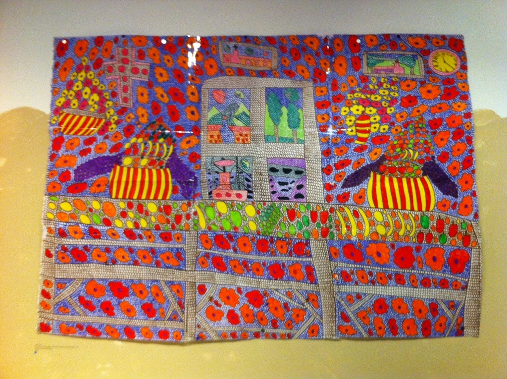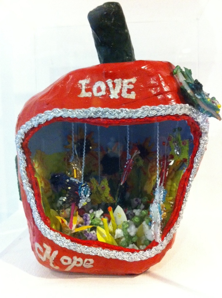 My top 3 favourite works were a painting by a secure patient called Lost Fruit (done on lined notepad sheets connected by duct tape, in markers! drawn in small circles!), and a small installation called Garden of Eden.