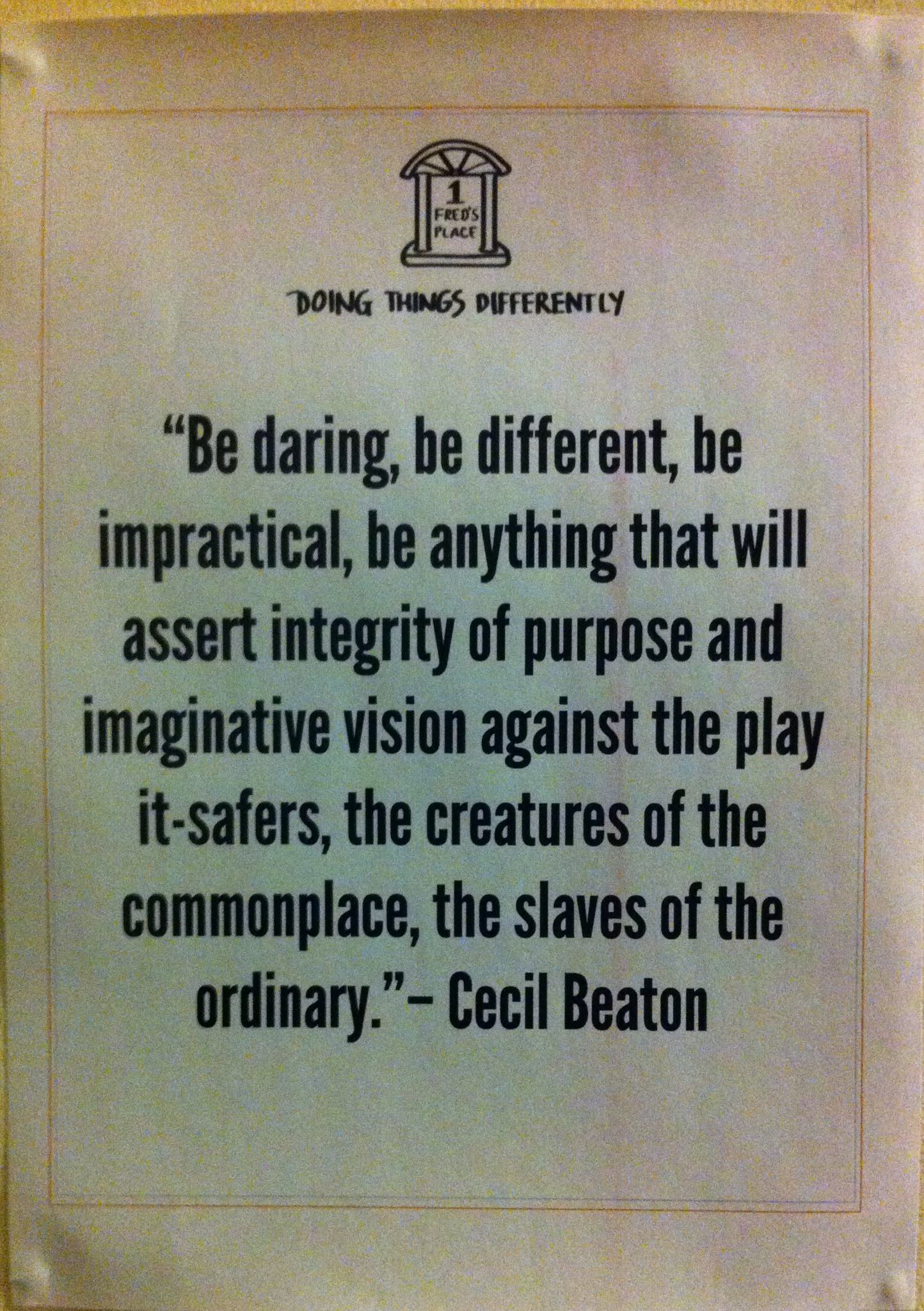 I often find myself in situations where I propose “crazy” ideas, or people listen to what I say and go ‘ok…’ or my point of view is seen as too extreme. I usually feel guilt and regret afterwards — what’s wrong with me, why can I not just be silent or say and do things that are more practical, more ‘normal’, more what people expect. After seeing this poster (thanks, Escape the City), I decided — no more guilt or regret for being different. As long as I am not mediocre. Stay how you are. Because you are perfect.