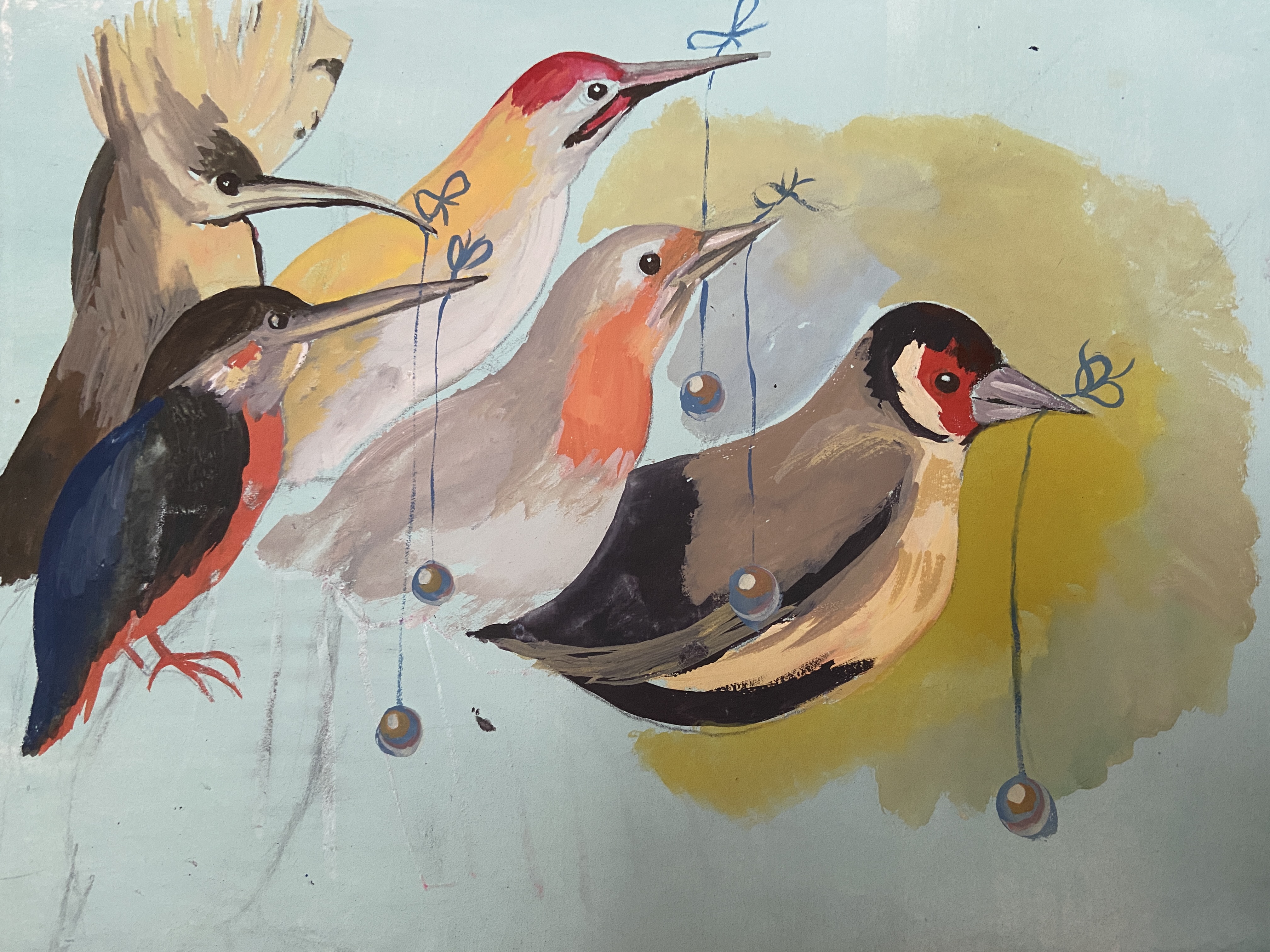 Cute, right? The idea was to put them onto a fun art background, together in one painting, and let them do something fun. I can’t paint so I thought I’d get individual portraits and combine them. I went on Etsy and researched and collected paintings of these birds, one by one, by different artists. They are not a perfect match, but (especially duck) look like they are having more fun!