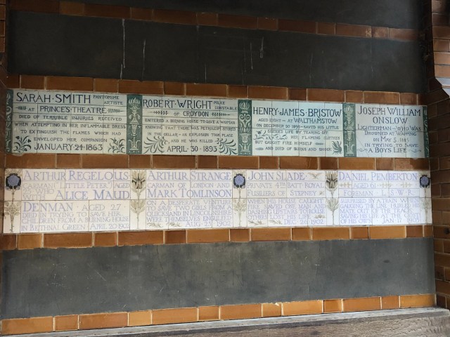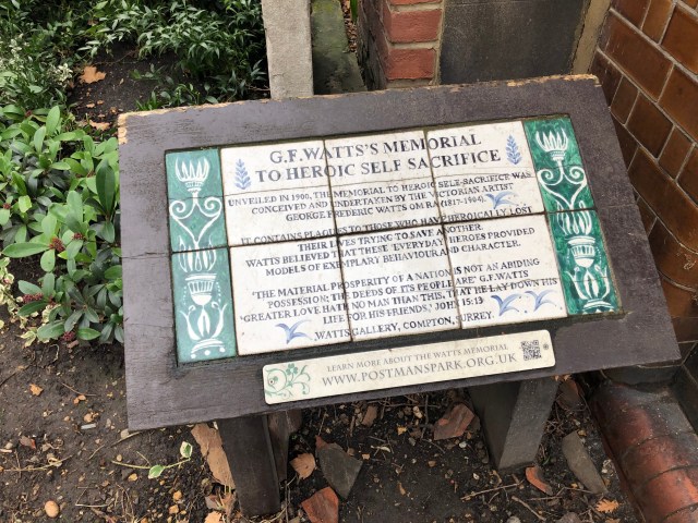 Postman’s Park is a a well maintained small patch of green in the heart of the City in London with a church, ancient tombstones and fountain, and flowers in bloom in any season. But its most memorable feature is the Memorial to Heroic Self-Sacrifice created by the Victorian painter and sculptor George Frederic Watts as a memorial to ordinary people who died while saving the lives of others and who might otherwise be forgotten.