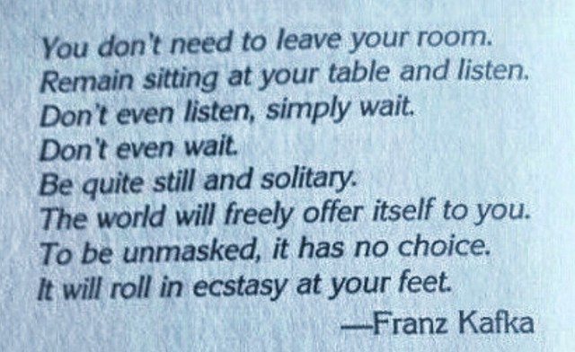 Kafka is right, you don’t need to do anything, go anywhere – instead slow down, stay still, emptiness will come and wash through you, don’t escape like you always do, don’t try to fill it – face it instead, let it fill your heart and discover that it’s a veil, yet another illusion behind which is a delightful fullness *insert Mona Lisa smiley*