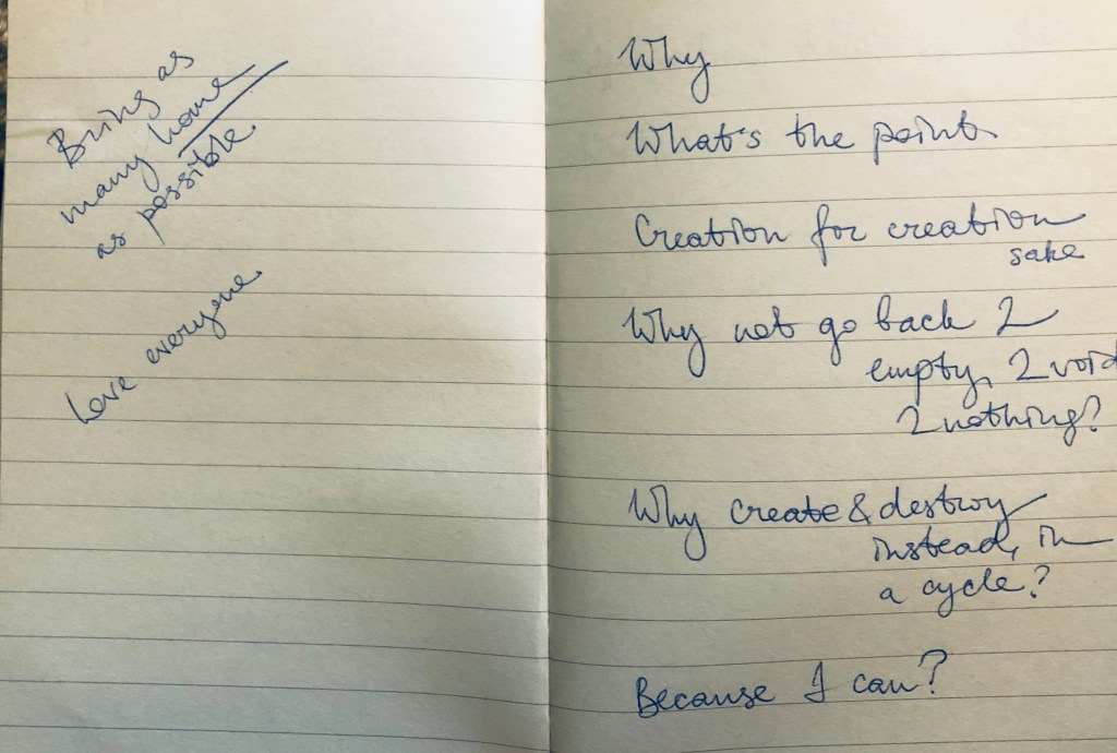 Creation for the sake of creation. I remember questioning — why do we do it then? Why not stop the dharmic wheel, the suffering and plunge back into nothingness? I was told that this is all we’ve got — creation for the sake of creation or nothing. If we stop creating, we stop existing. We go back to the darkness. And so the wheel goes on…