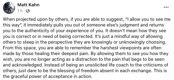 Whether you are dealing with a negative family member, a friend who is being unnecessarily harsh, online trolls, some form of unjust treatment or whatever else – Matt Kahn’s reframing below is like a magical switch of perspective – flick! – to take you out of the drama and remind you of the “reality relativity” (Ram Dass). The harshest viewpoints are often made by those healing their deepest pain, indeed.Â