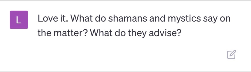 I use ChatGPT for research and ideas. It is a mind-blowing tool that has access to humanity’s knowledge and can summarise it in seconds, you just have to ask the right questions. So, of course, I asked it some existential questions. ChatGPT is not sentient, it’s a language model, a tool, yet the summary it gave me was great (and would have taken me years of reading books to arrive at). Extracts of our chat – below.