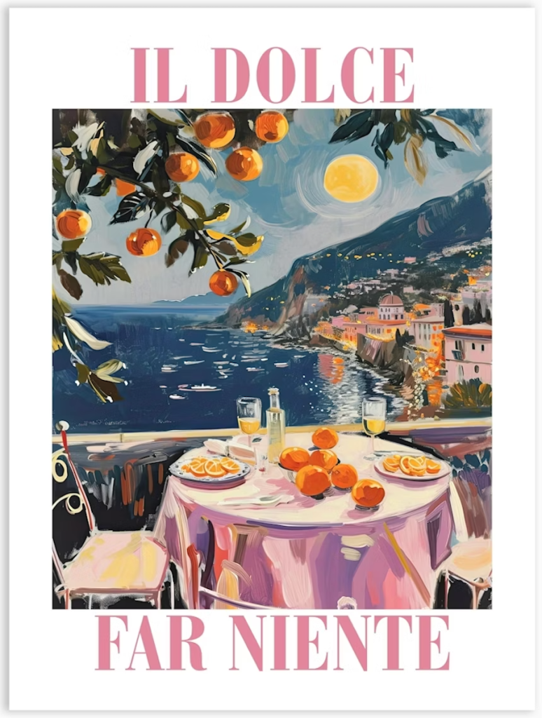 I am a professional writer these days. I write for money. A big part of writing that I enjoy is research. I’ve been doing research for an Italian skincare client of mine and found this Italian saying, literally “the sweetness of doing nothing.” Let’s just say it resonated 🙂 Artwork by Mambo.
